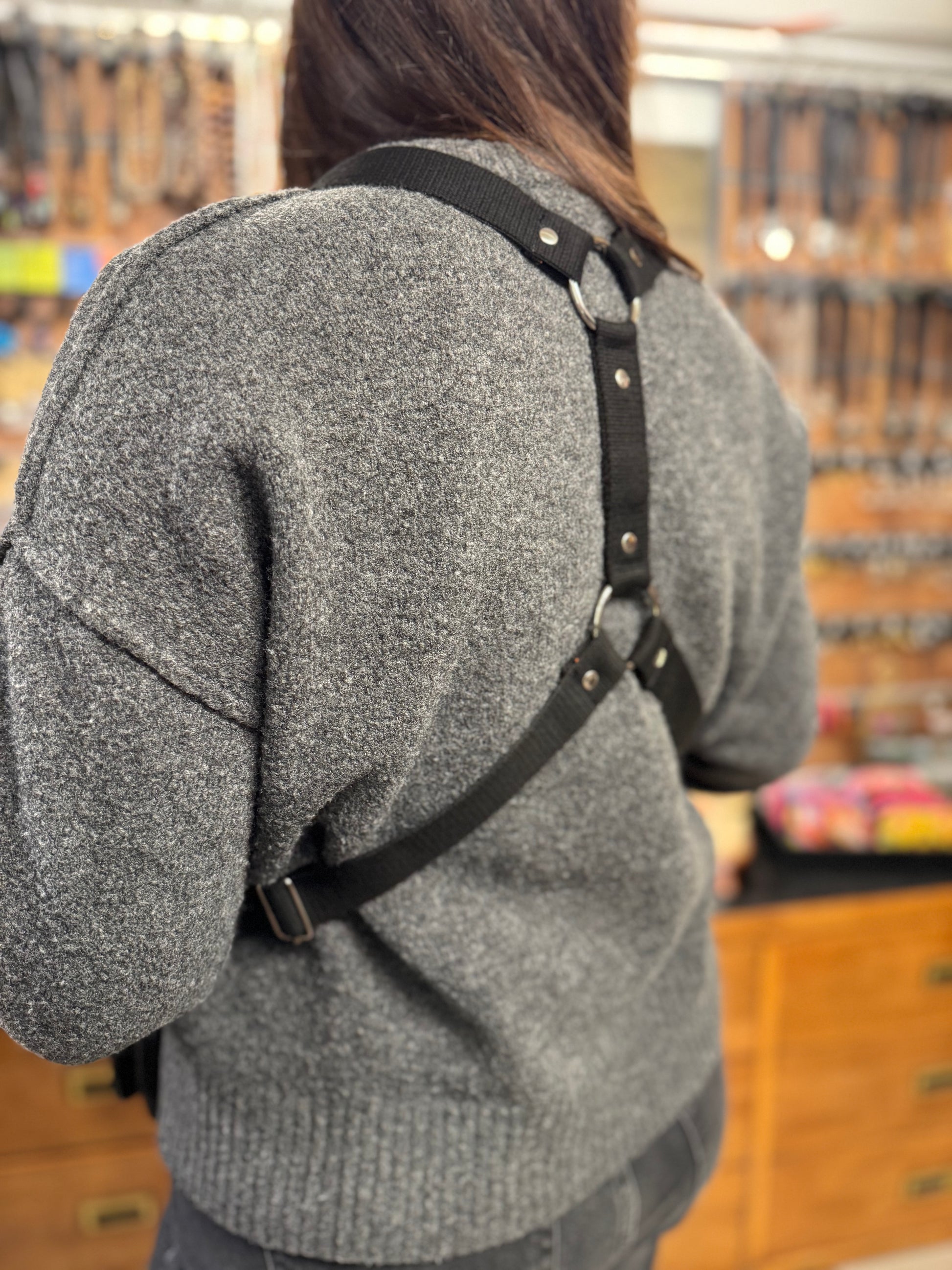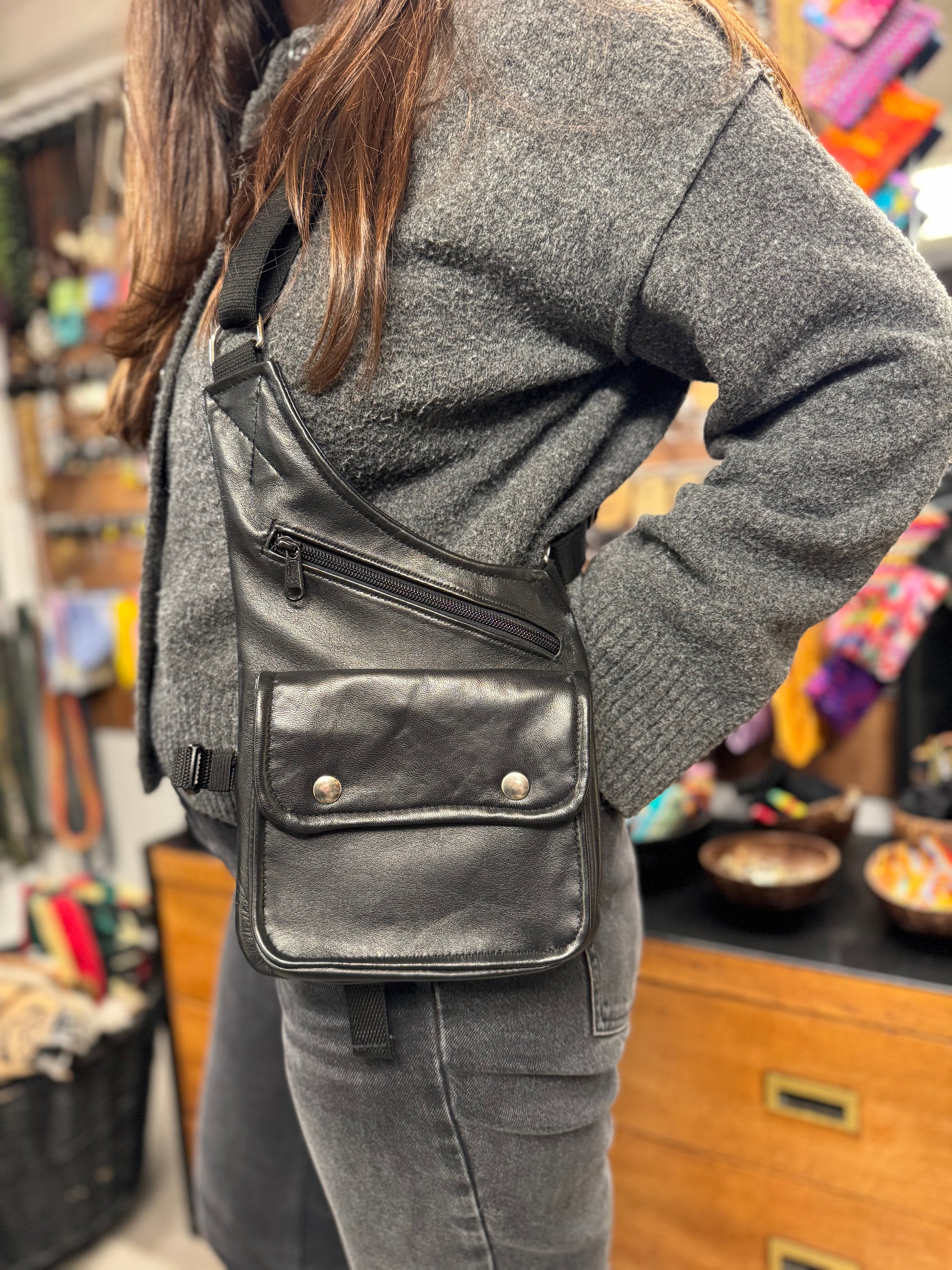 Pistolera artesanal hecha en piel en color negro. Con grandes y cómodos bolsillos a ambos lados. Modelo ajustable por la espalda. Todas las costuras están reforzadas.