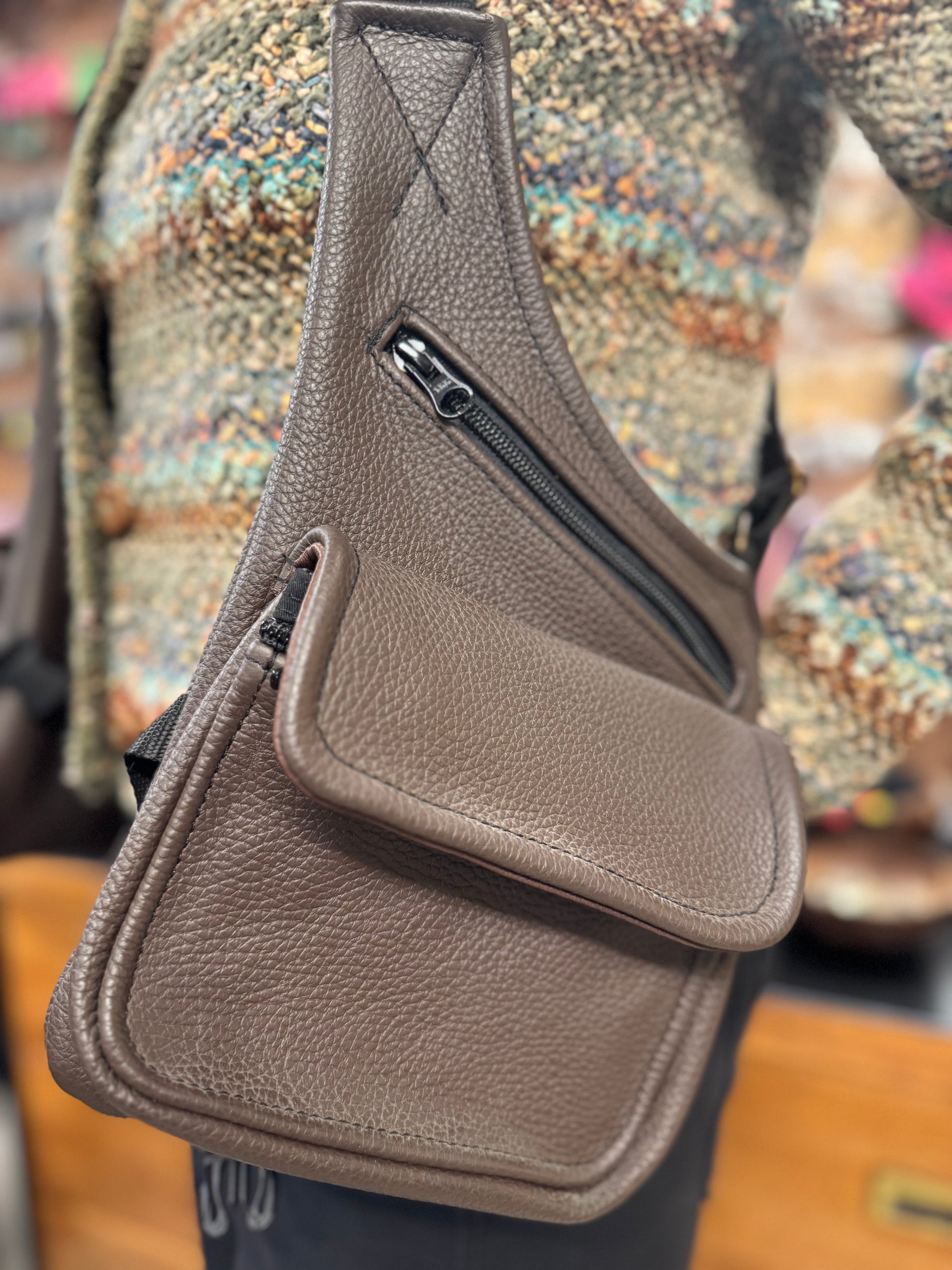 Pistolera artesanal hecha en piel en color marrón. Con grandes y cómodos bolsillos a ambos lados. Modelo ajustable por la espalda. Todas las costuras están reforzadas.