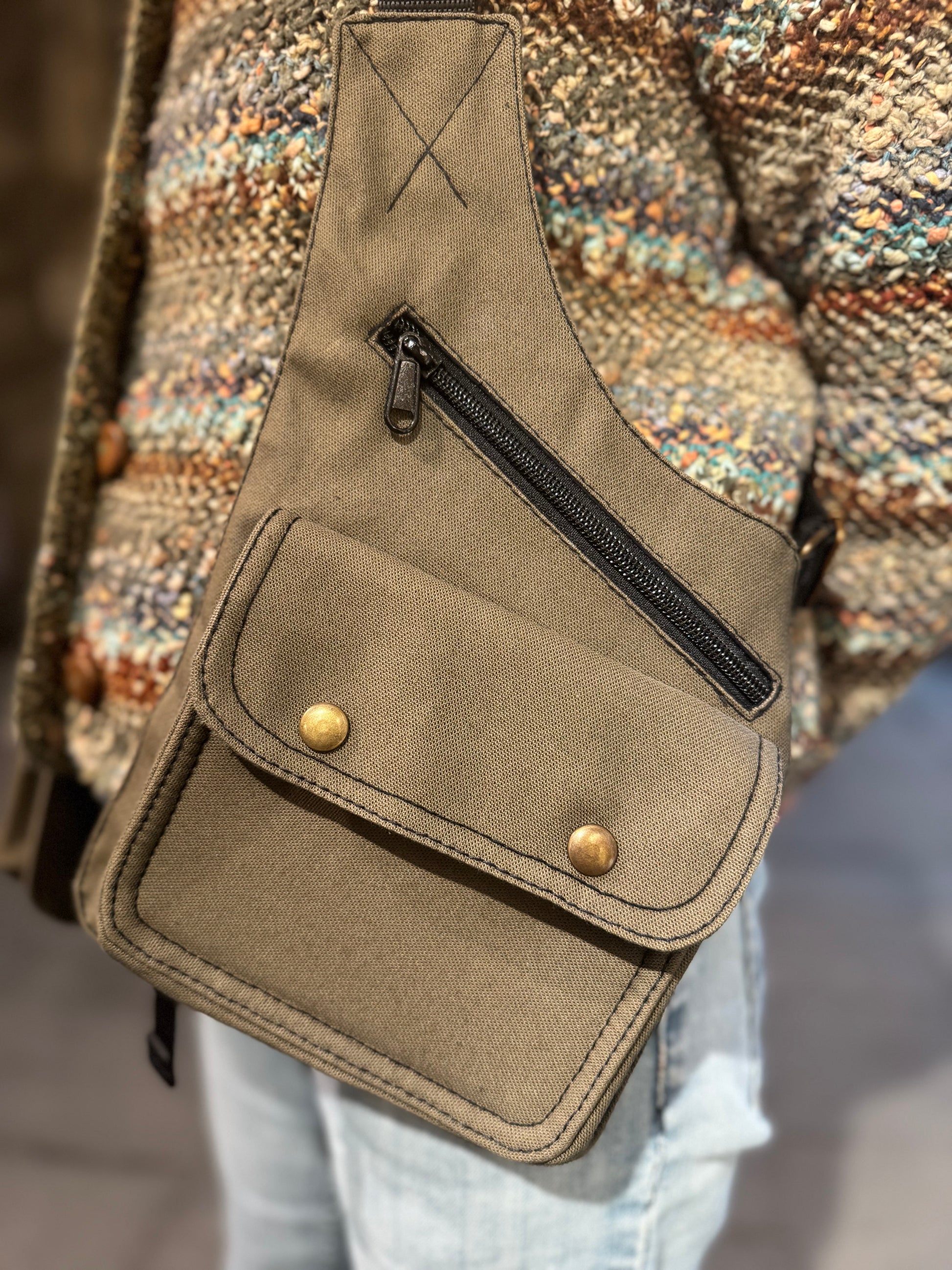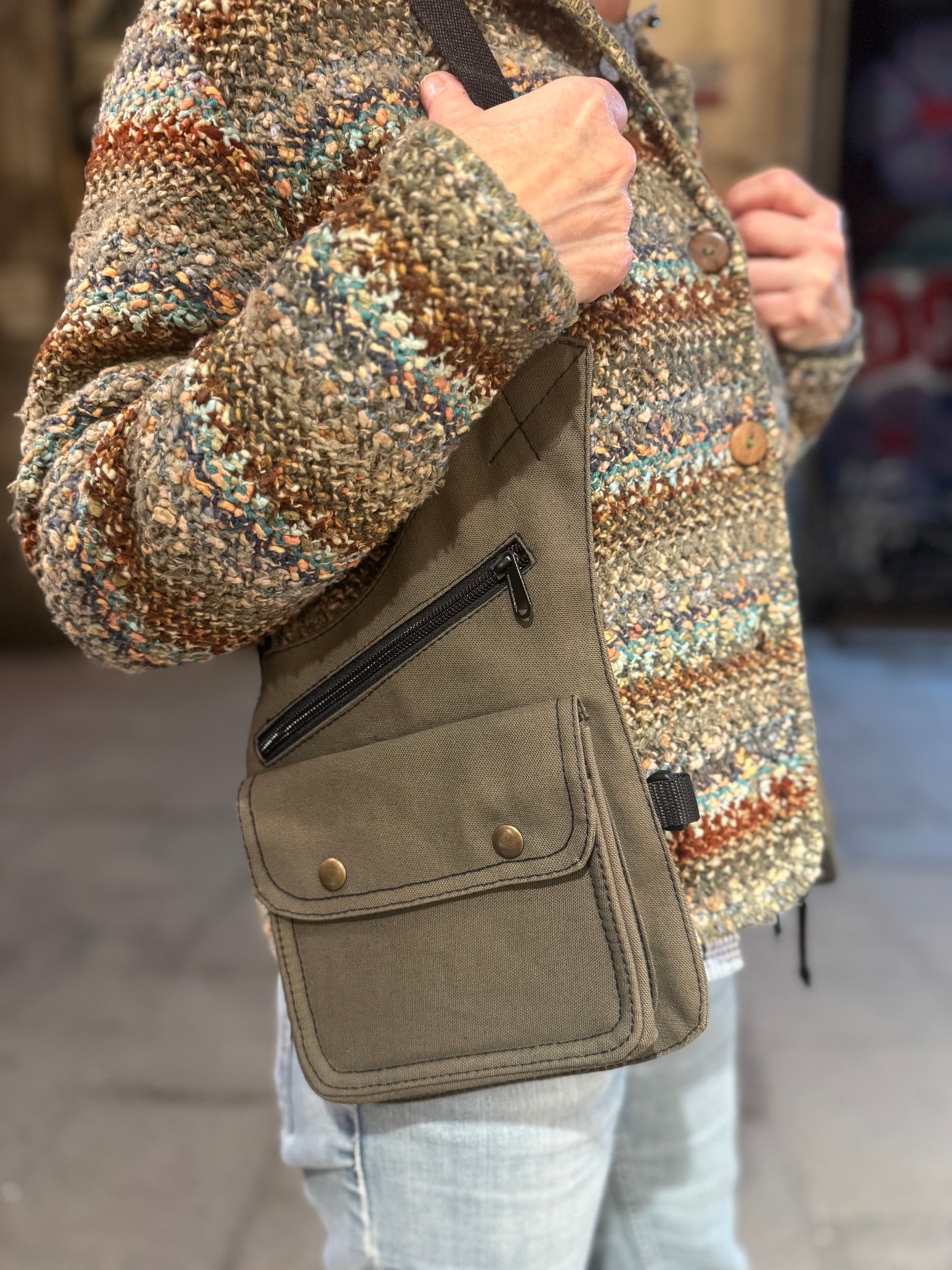 Pistolera artesanal hecha en tela en color verde caqui. Con grandes y cómodos bolsillos a ambos lados. Modelo ajustable por la espalda. Todas las costuras están reforzadas.